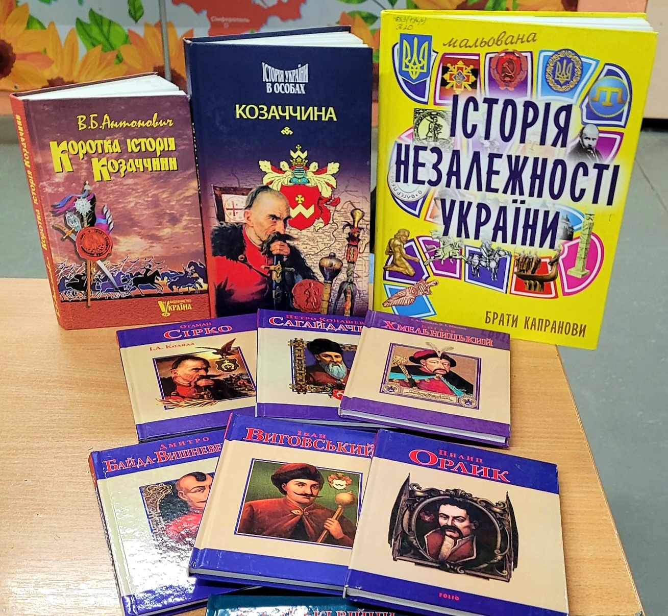 До уваги учнів бібліотекарі представили тематичну поличку «Нащадки славних козаків – захисники України», ознайомили з книгами про надзвичайно багату подіями та героями козацьку епоху, славні козацькі традиції, видатних представників козацької доби.