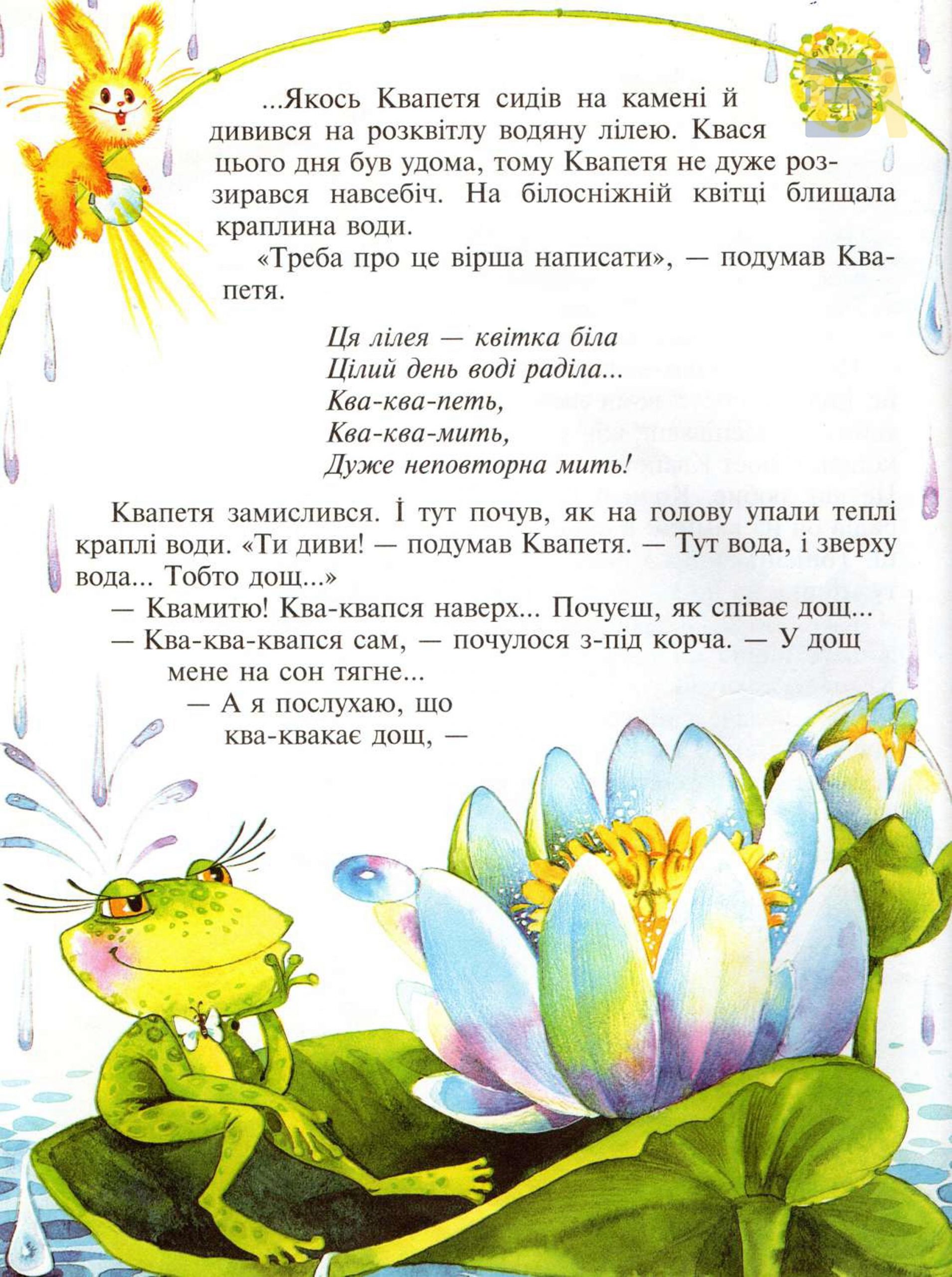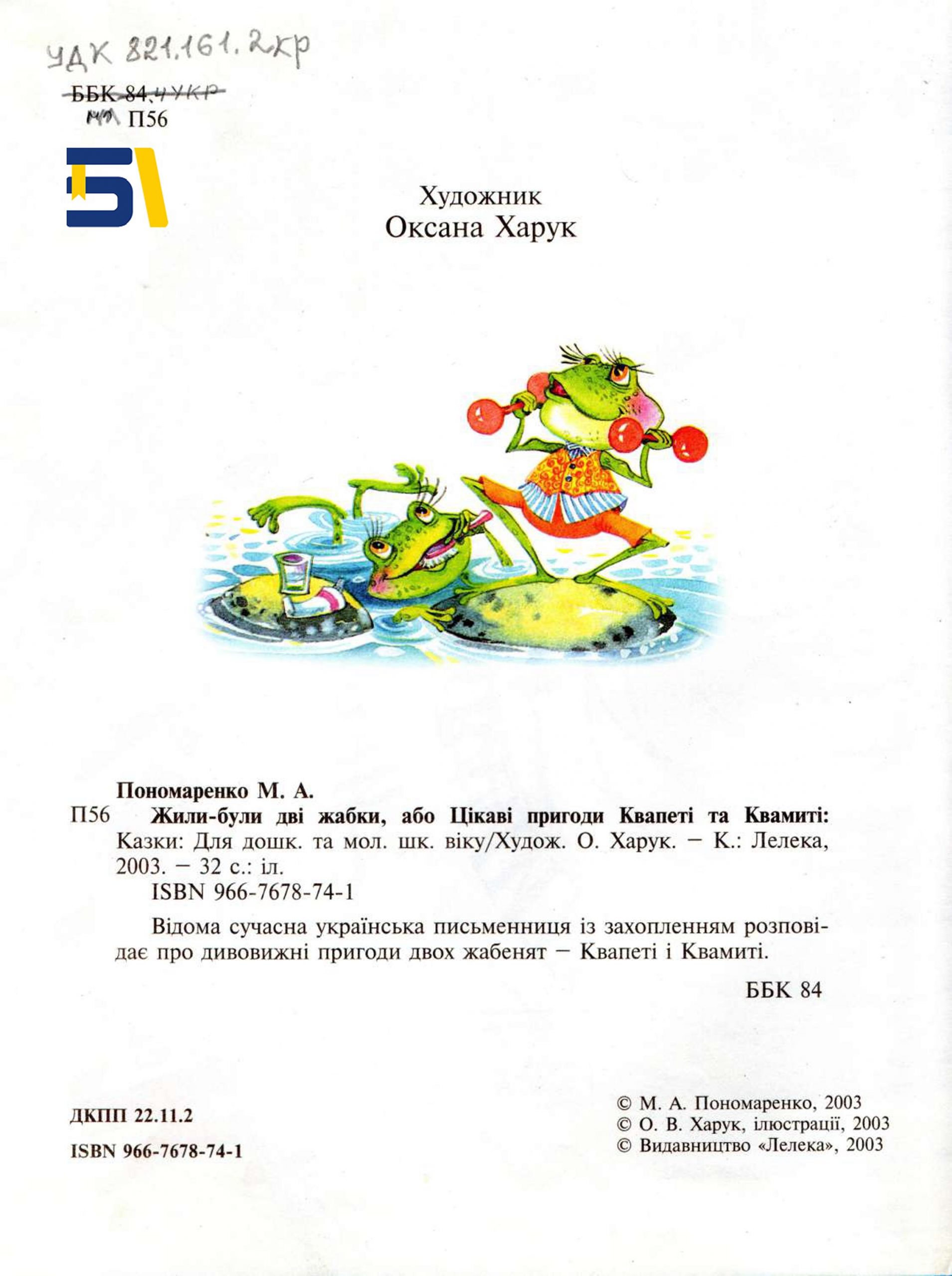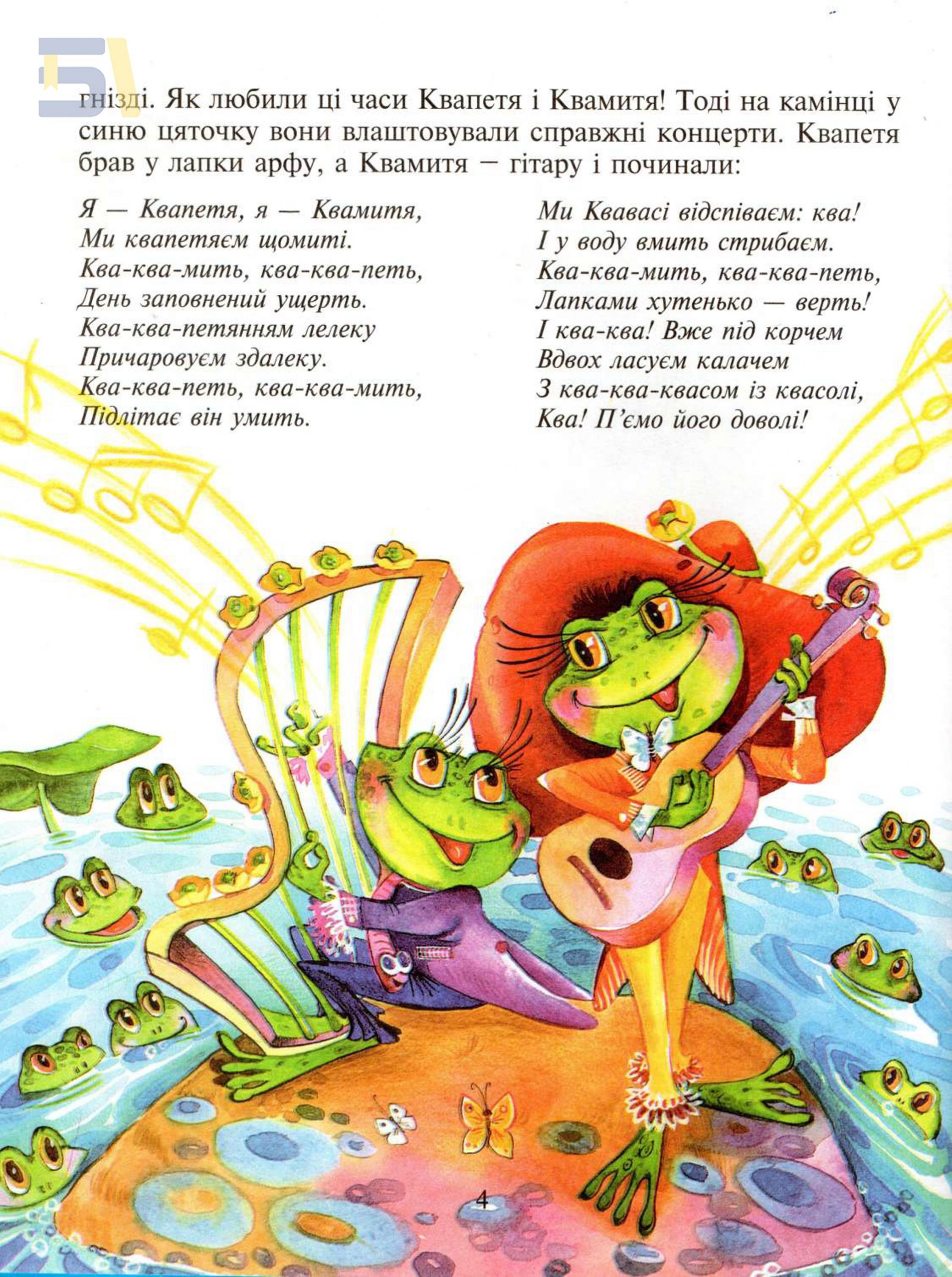 Головними героями казки «Жили-були дві жабки, або Цікаві пригоди Квапеті та Квамиті» є двоє друзів-жабенят. Письменниця весело і цікаво розповідає про дивовижні пригоди поета Квапеті і композитора Квамиті, які складали пісеньки та співали, акомпануючи собі на гітарі й арфі.
