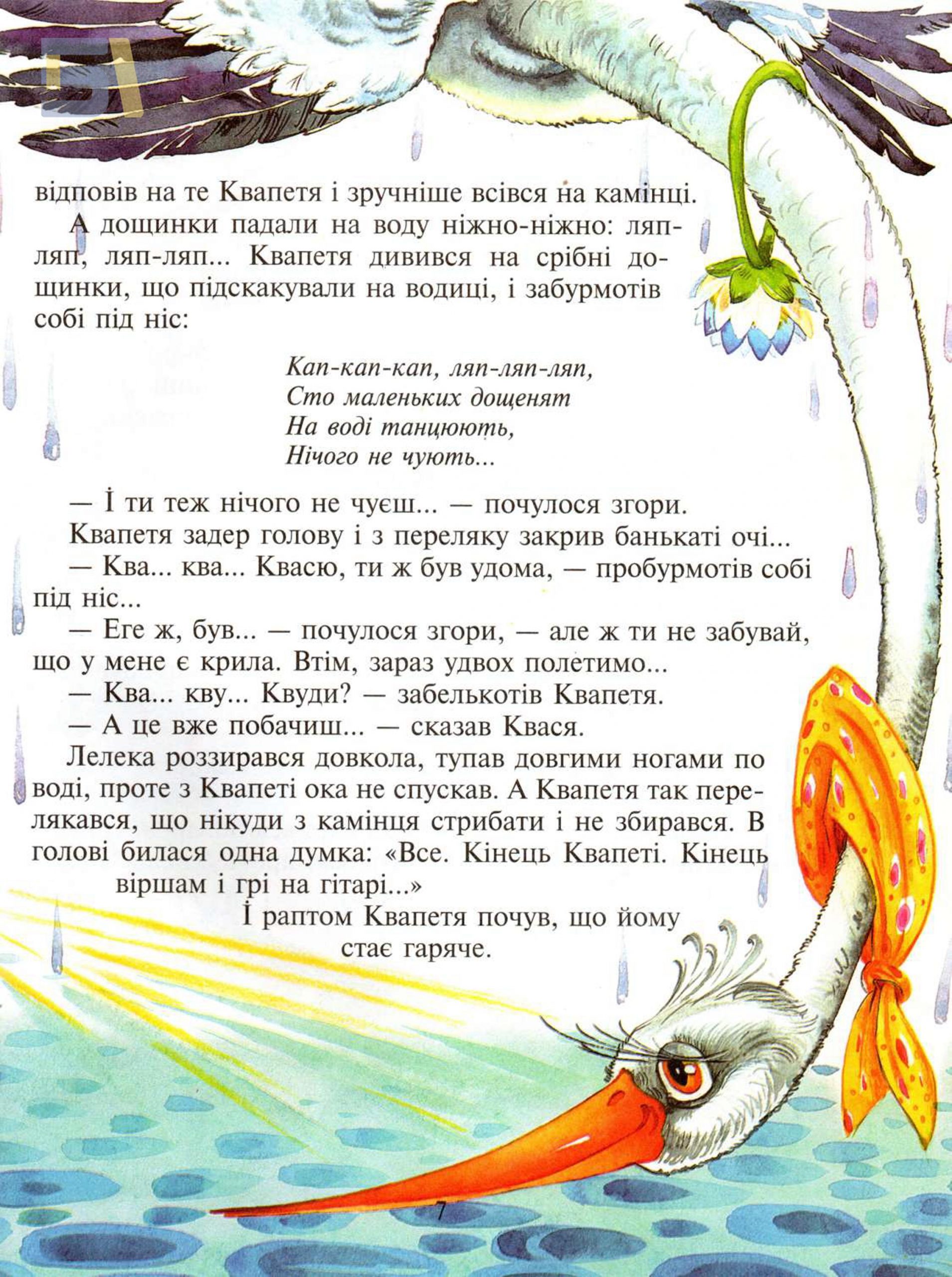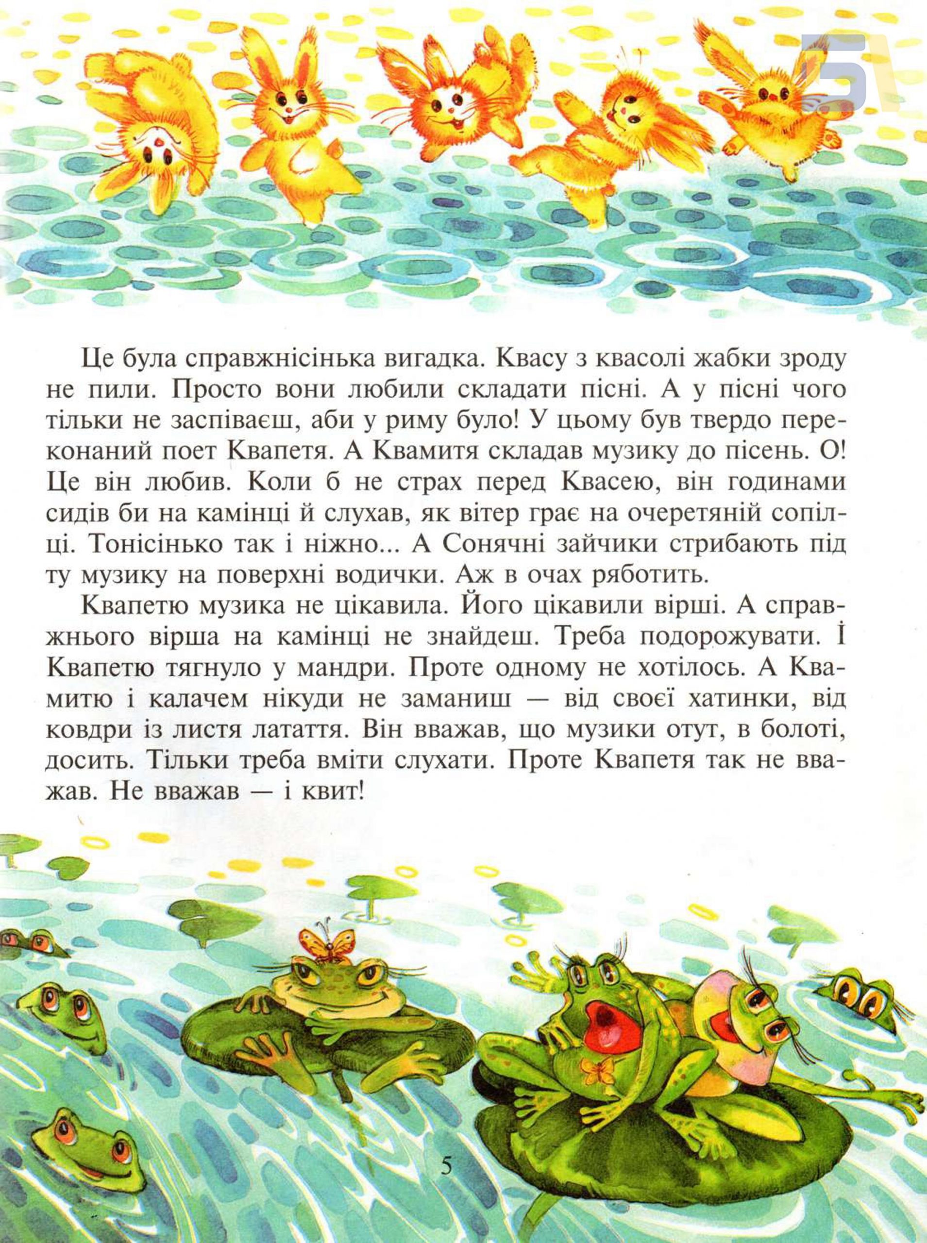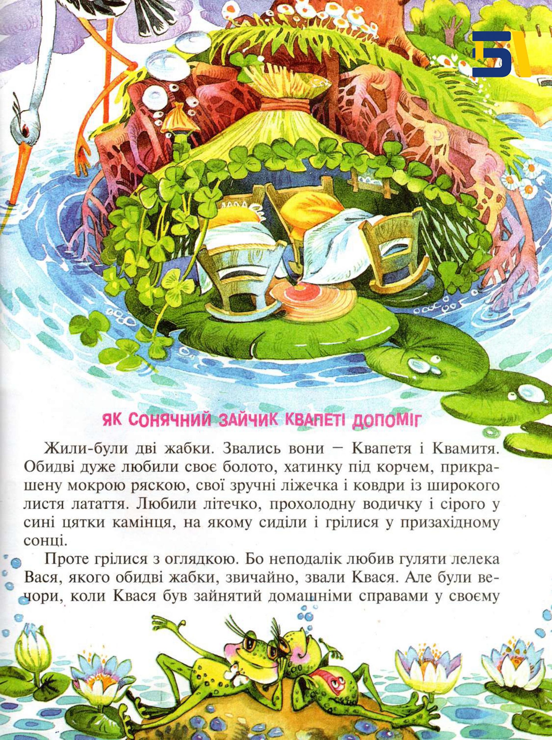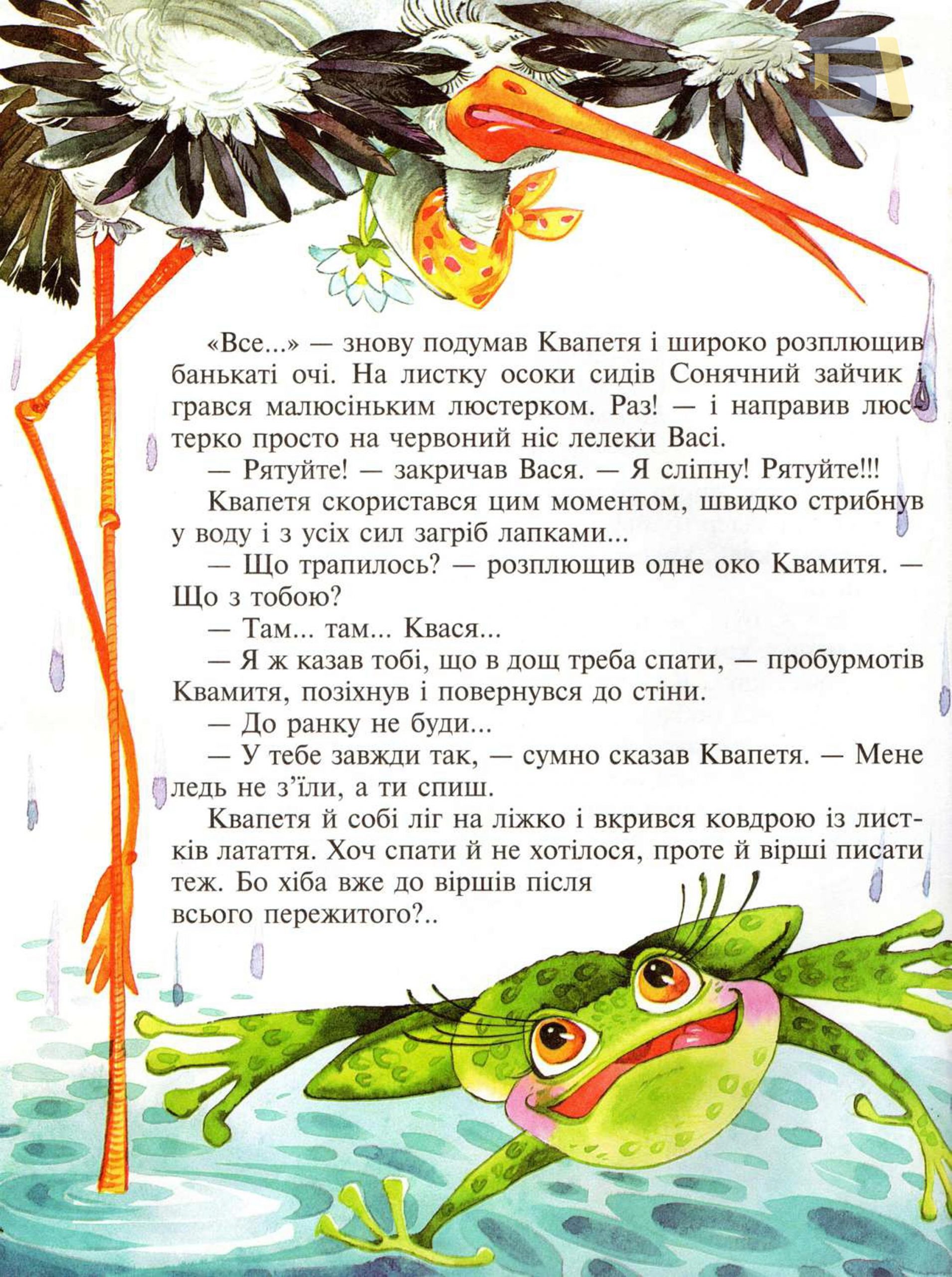 Головними героями казки «Жили-були дві жабки, або Цікаві пригоди Квапеті та Квамиті» є двоє друзів-жабенят. Письменниця весело і цікаво розповідає про дивовижні пригоди поета Квапеті і композитора Квамиті, які складали пісеньки та співали, акомпануючи собі на гітарі й арфі.