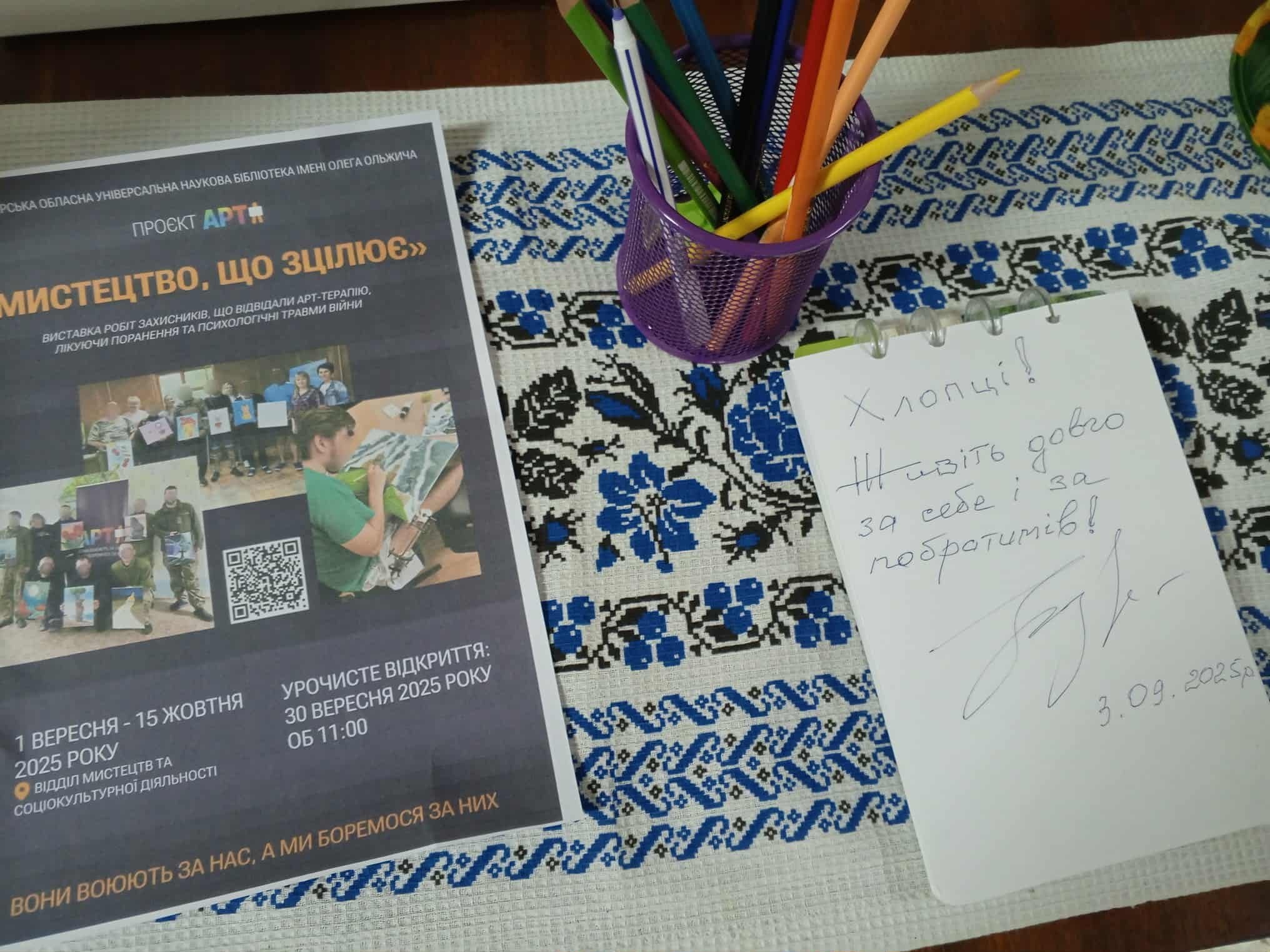 Ми мали честь відвідати виставку проєкту «АртА», доповнену новими творчими роботами. Її створили наші добрі друзі та партнери на чолі з Вікторією Козел і потужною командою. Експозиція розміщена у залі Житомирської обласної універсальної наукової бібліотеки імені Олега Ольжича. Тут представлені роботи захисників, які через арт-терапію зцілюють поранення та психологічні травми війни. Це не просто мистецтво — це свідчення сили духу, мужності та незламності людини.