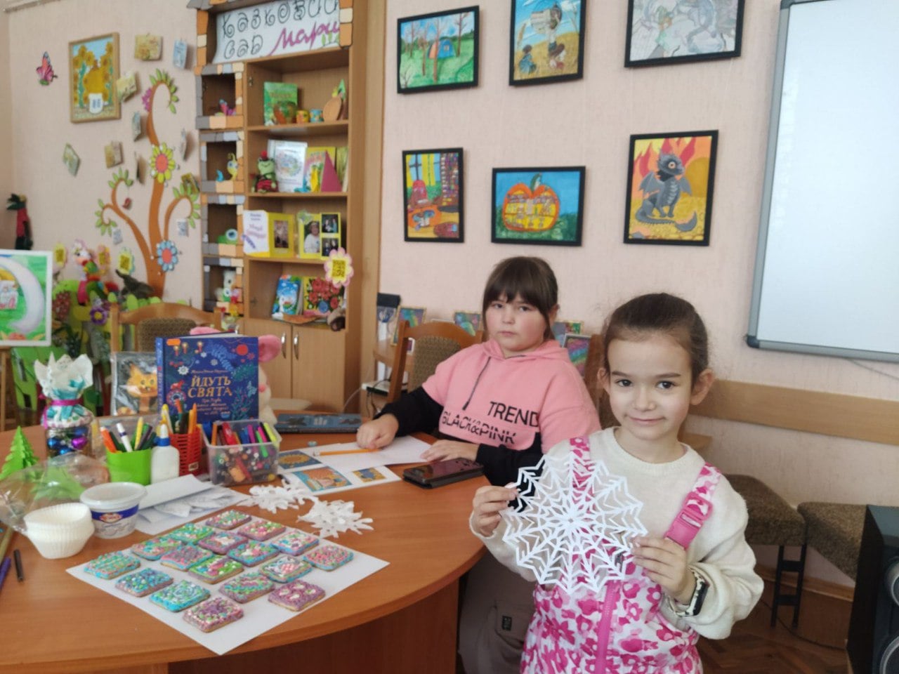 У майстерні радості «Виблискує сніжинка на моїй долоньці» бібліомайстрині навчали малечу виготовляти сніжинки різні за складністю і формою. Діти прикрасили свої поробки кольоровими візерунками з блискіток.
