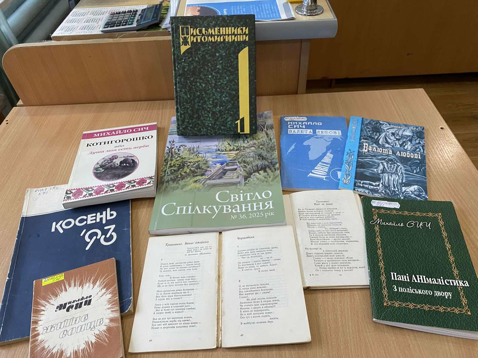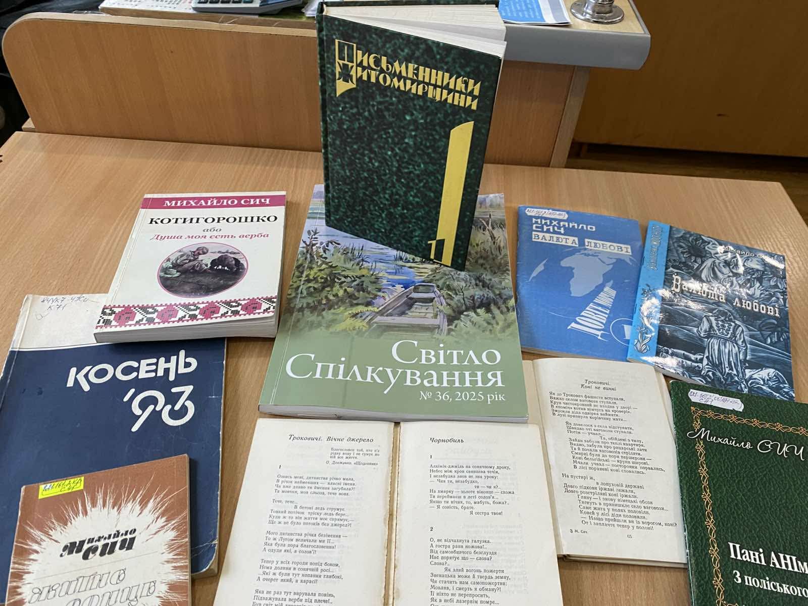До 85-річчя від дня народження Михайла Семеновича Сича в бібліотеці організовано книжкову виставку-спогад «Співець землі черняхівської» в межах програми «Житомирщина культурна» присвячену його життю, діяльності та творчому доробку нашого земляка. Експозиція знайомить відвідувачів із виданнями автора, публікаціями про нього, а також матеріалами, що висвітлюють його внесок у розвиток української культури та духовних цінностей.