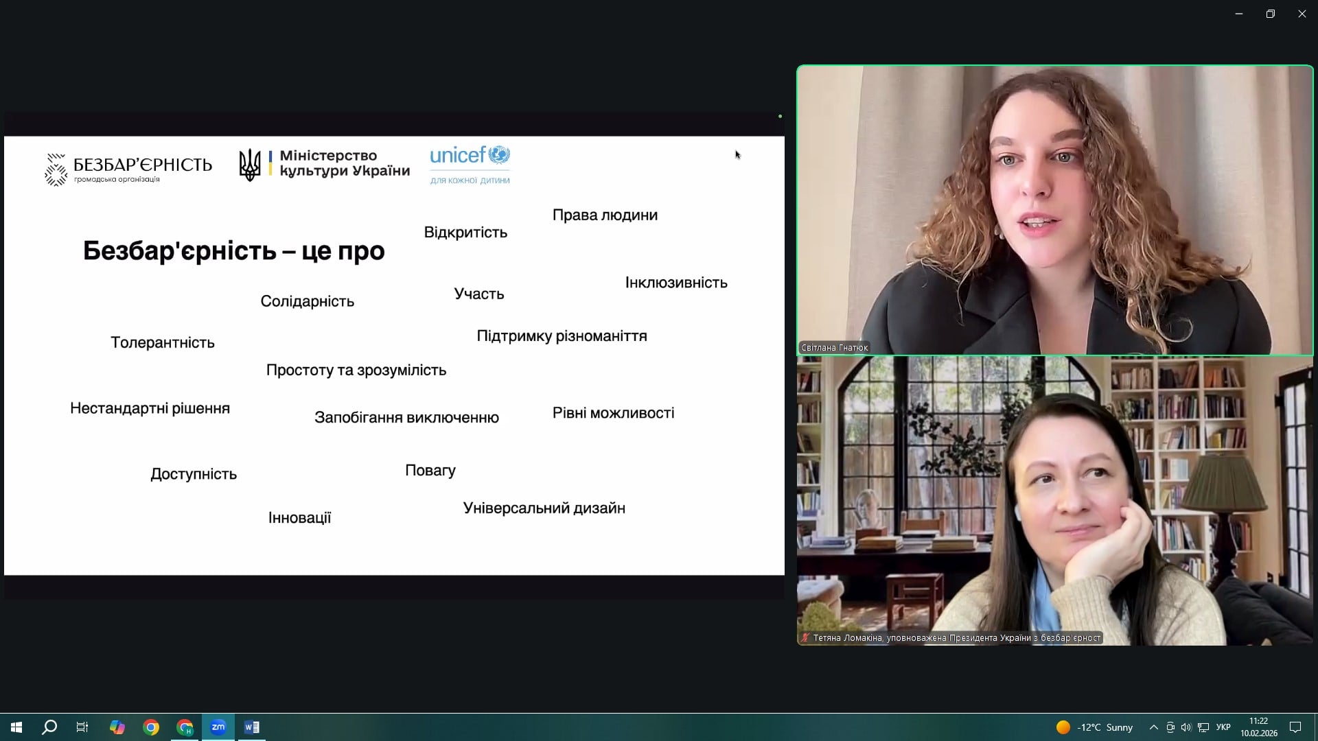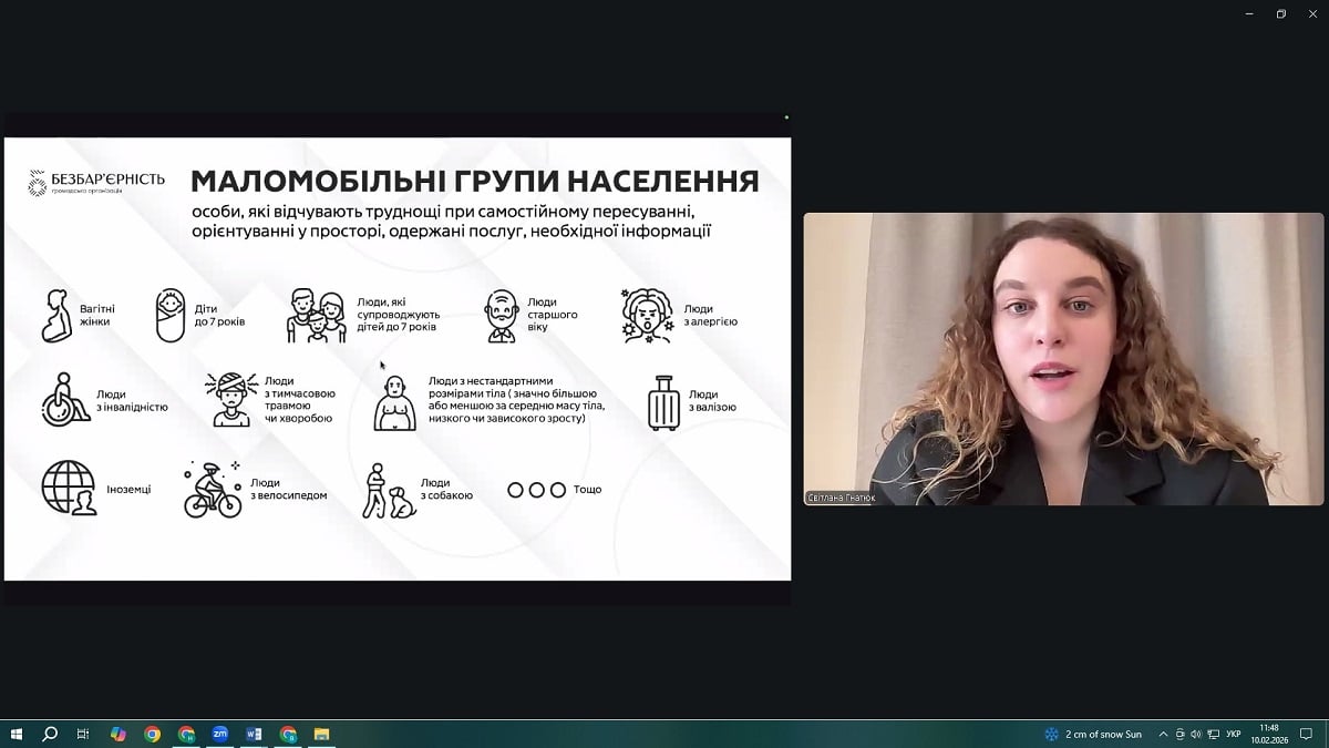 Захід став частиною серії онлайн-навчань, спрямованих на підвищення обізнаності представників закладів культури щодо принципів безбар’єрності. Учасники опанували базові поняття, ознайомилися з цільовими аудиторіями, нормативно-правовим регулюванням у цій сфері, а також визначили основні види бар’єрів і практичні шляхи їх подолання.