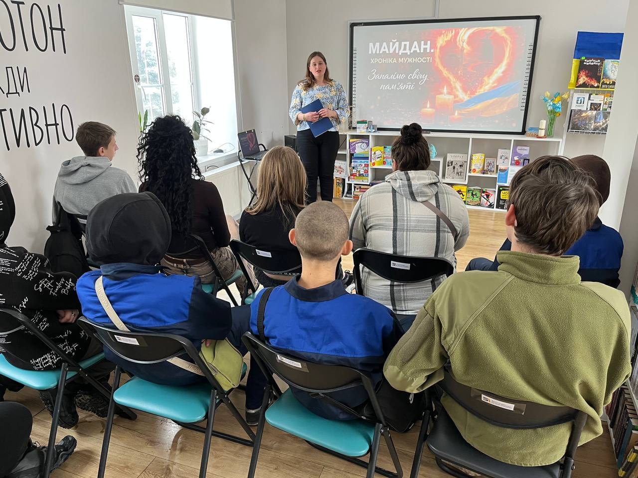 Родзинкою зустрічі стало живе спілкування з очевидцем подій — бібліографом, краєзнавцем, істориком Канчурою Віктором Юрієвичем. Він поділився особистими спогадами про події на Майдані, продемонстрував світлини та відеоматеріали, а також розповів про наших земляків, які загинули під час Революції Гідності та входять до числа Героїв Небесної Сотні. Його розповідь стала глибоким і зворушливим свідченням історії, що творилася на наших очах.