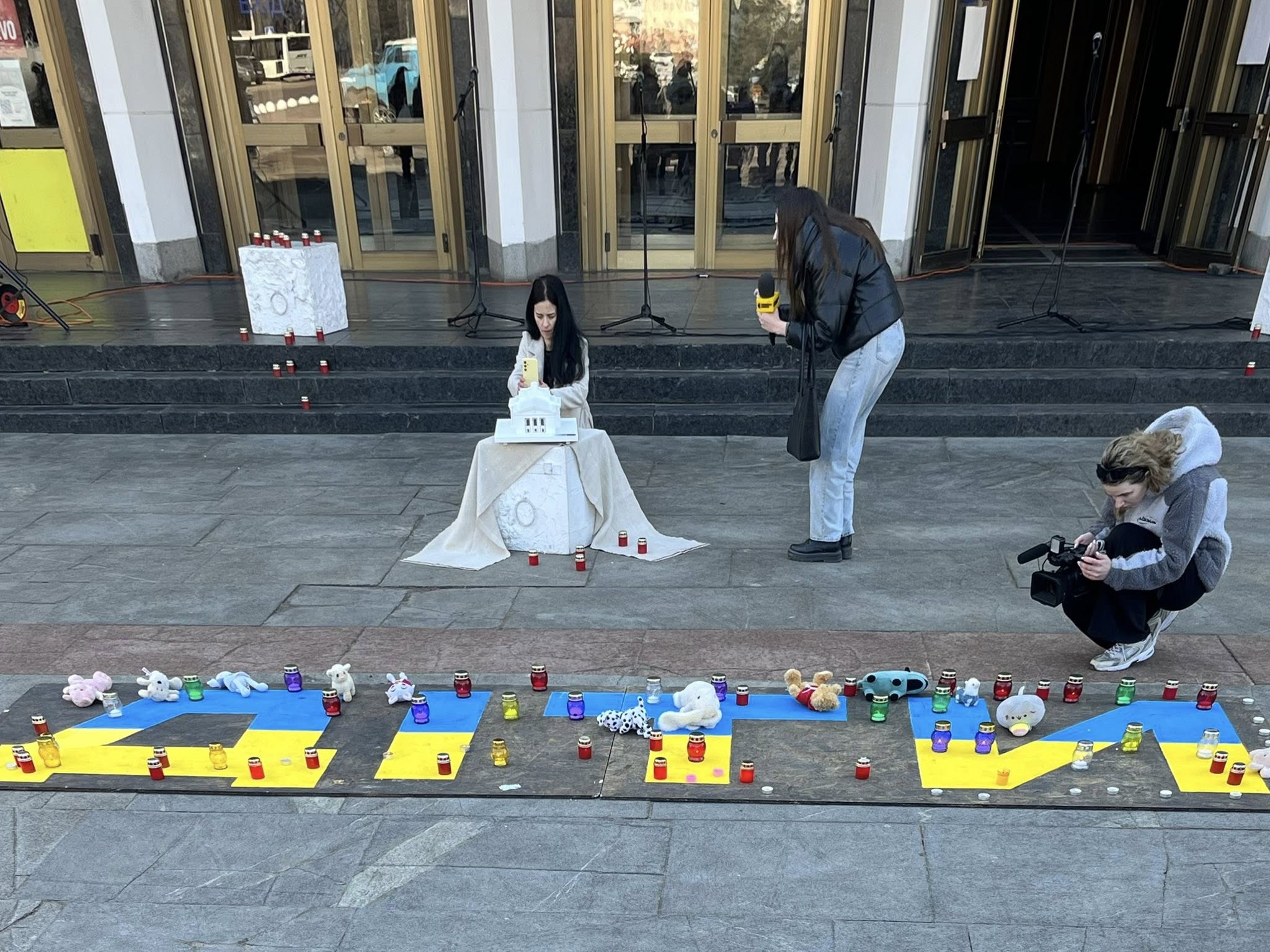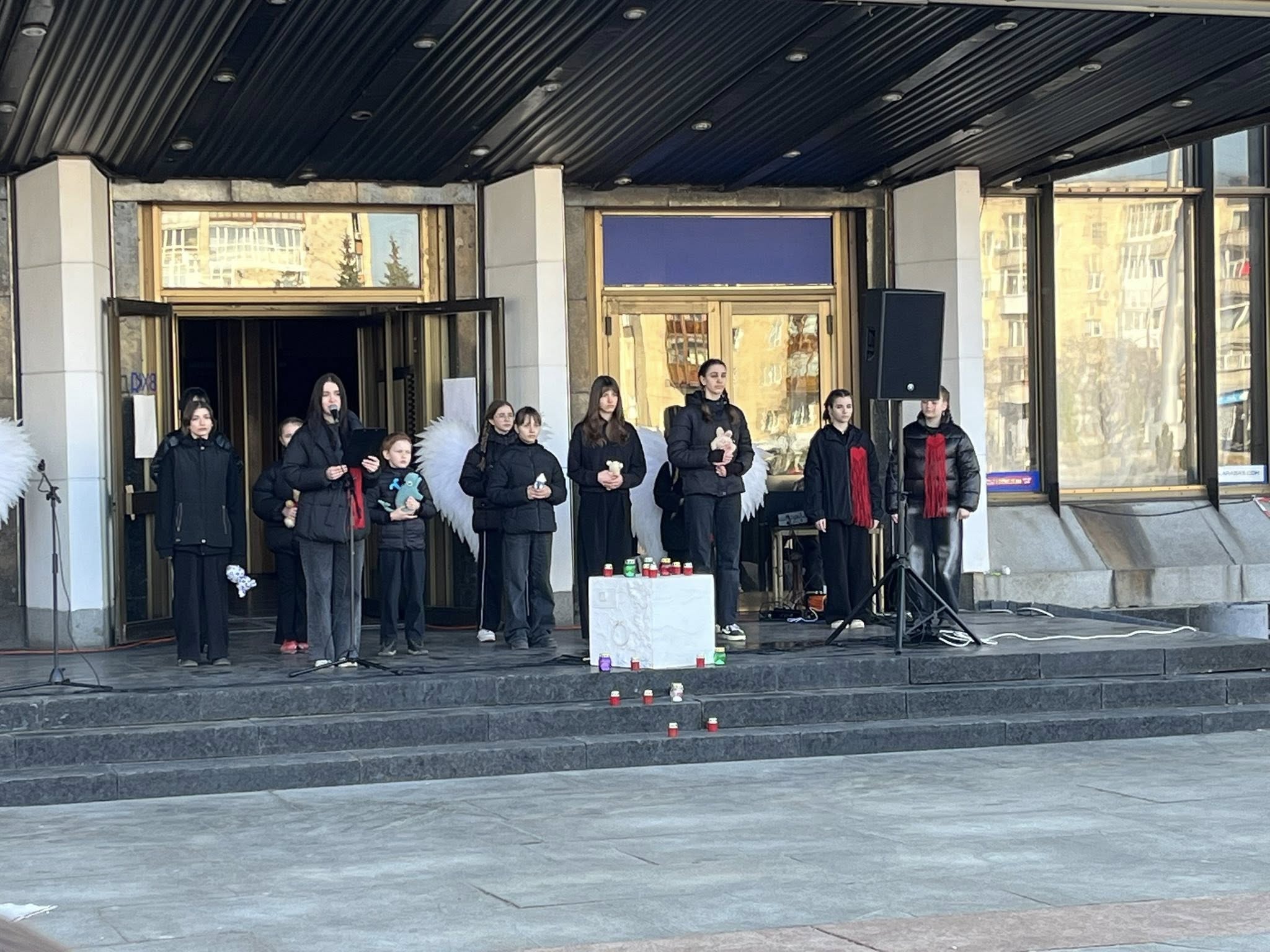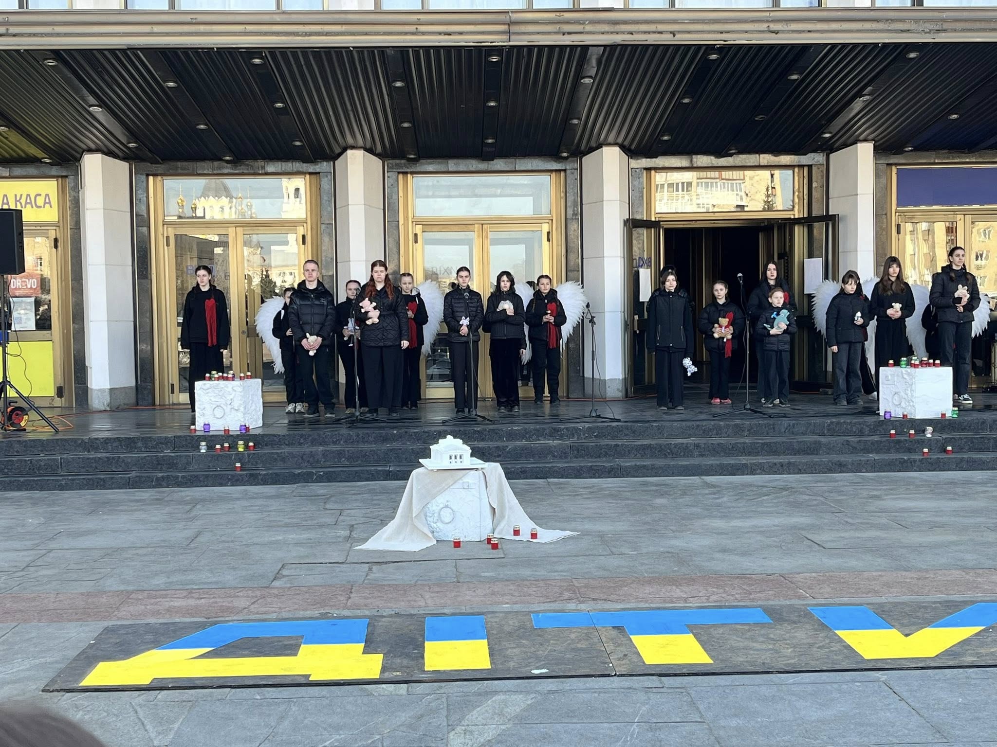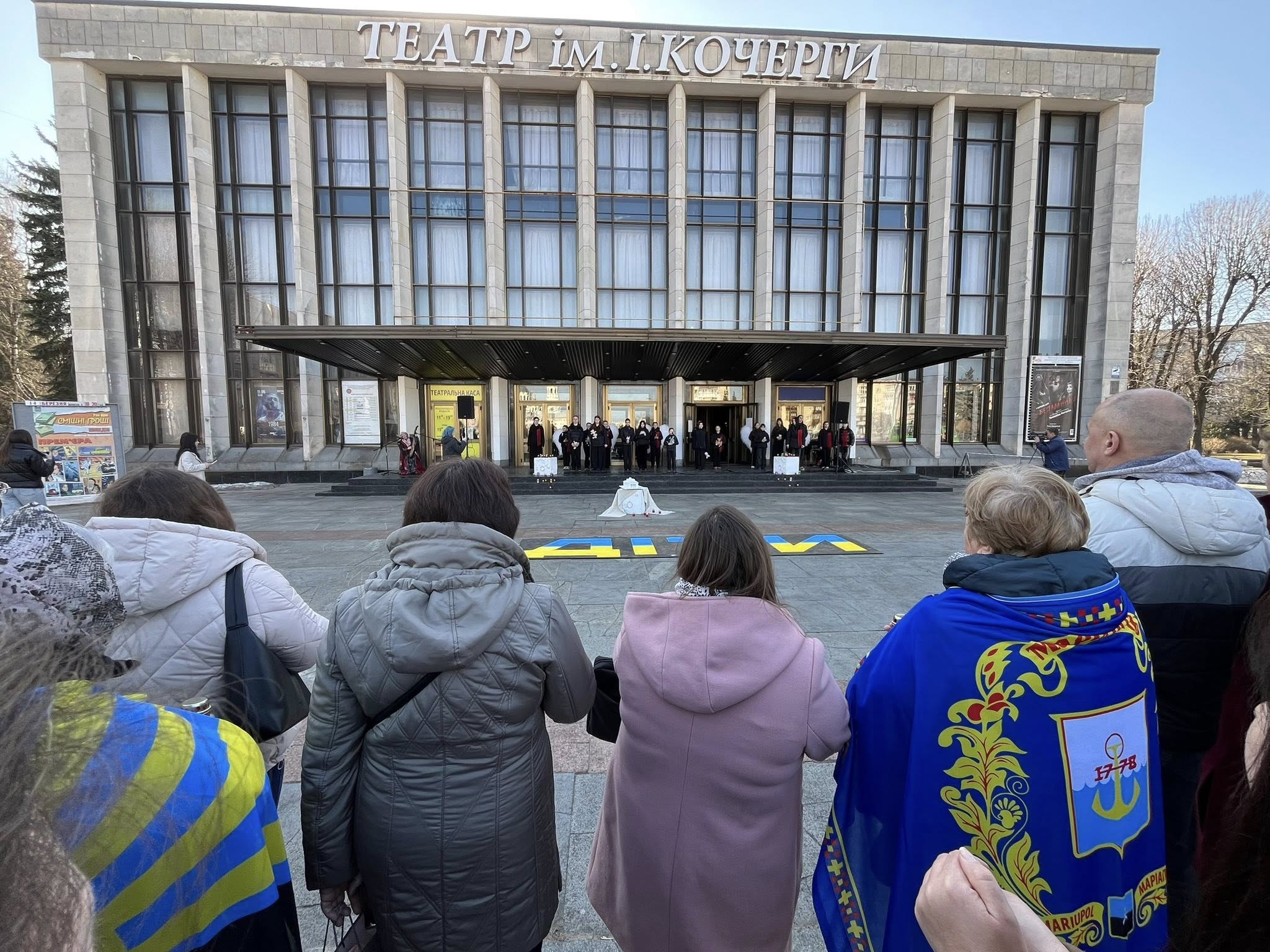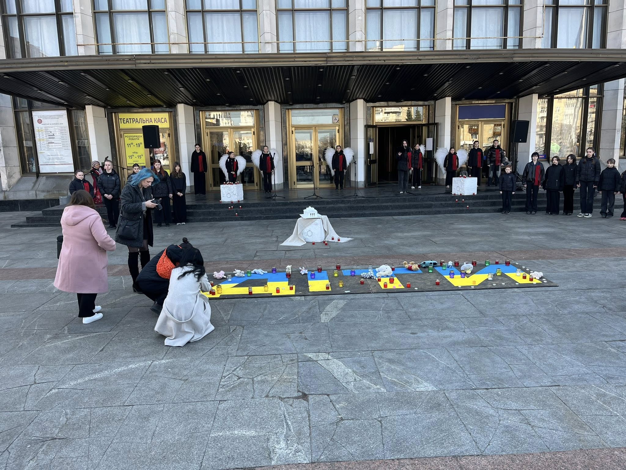 Під час заходу на площі перед театром учасники відтворили напис «ДІТИ» – знак, який у березні 2022 року був нанесений перед будівлею Маріупольського драмтеатру, де від обстрілів ховалися сотні мирних людей.