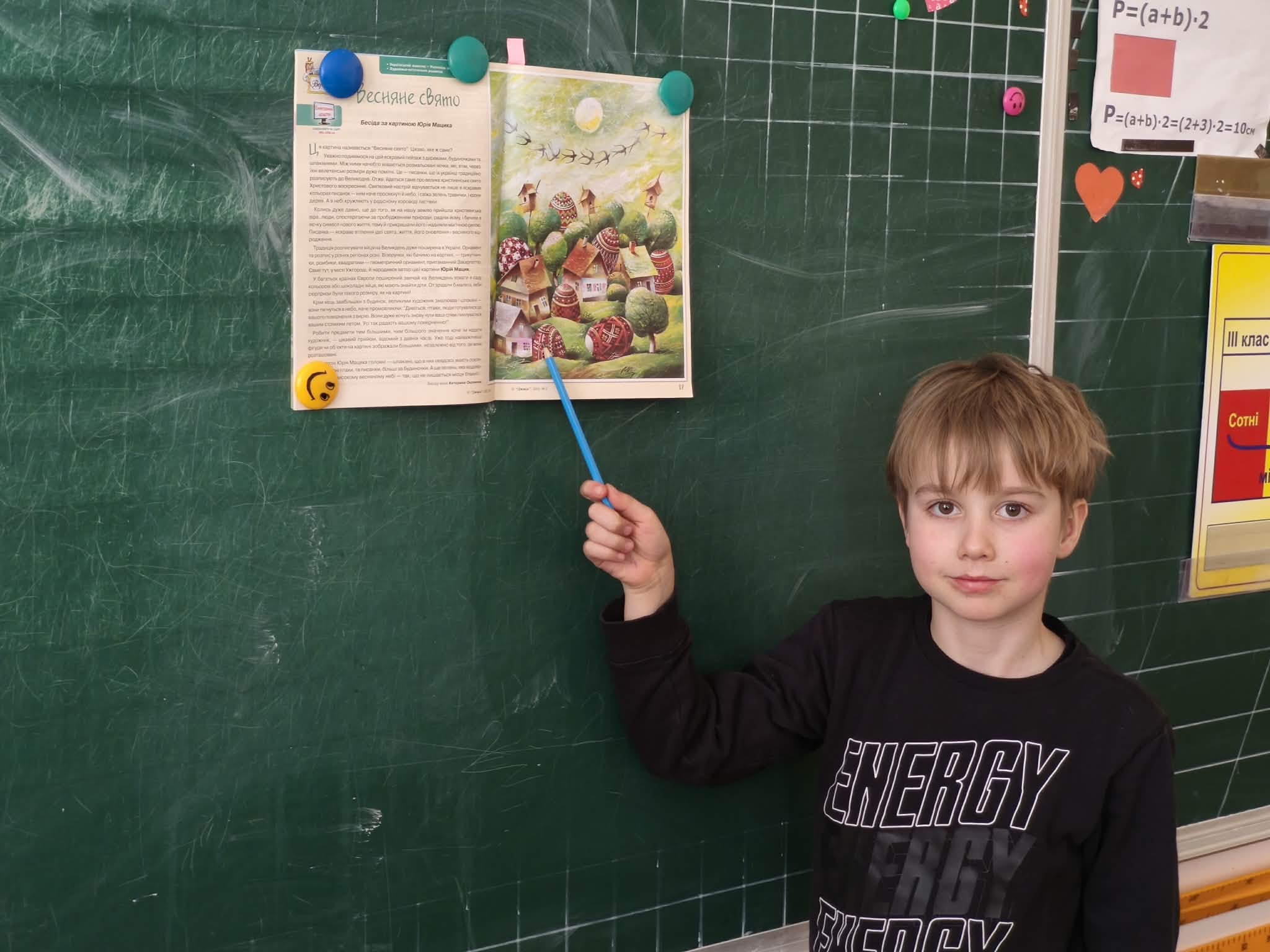 Картина подає яскравий пейзаж, де зображені дерева, будиночками і шпаківні, а між ними ховаються розмальовані яєчка. Це — писанки, що їх українці традиційно розписують до Великодня. Отже йдеться саме про світле свято Христового Воскресіння.