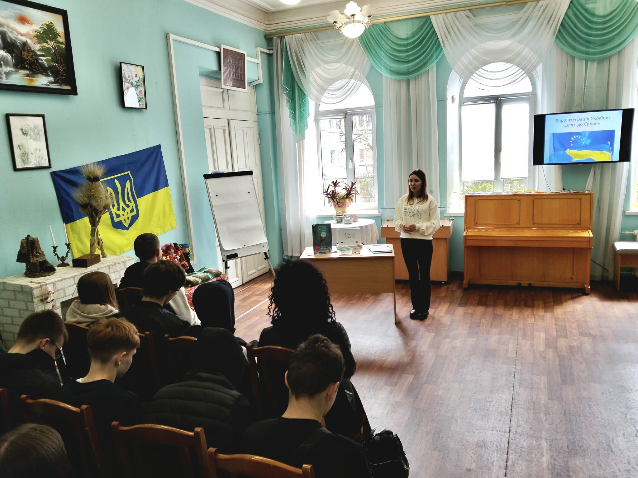 Учасники дізналися більше про шлях України до європейської спільноти, ключові цінності, на яких ґрунтується Європейський Союз – демократію, свободу, рівність, повагу до прав людини. Обговорили можливості, що відкриває євроінтеграція для молодого покоління: освіта, подорожі, участь у міжнародних програмах, розвиток власного потенціалу.